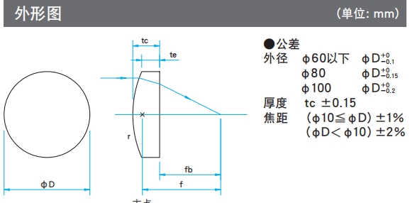 ?有從可見光到近紅外用的BK7材料的透鏡,和可用于350nm以下紫外光的高激光損傷閾值的合成石英透鏡,和適用于ArF(193nm)和KrF(248nm)的準分子激光用合成石英透鏡,這三種類型。