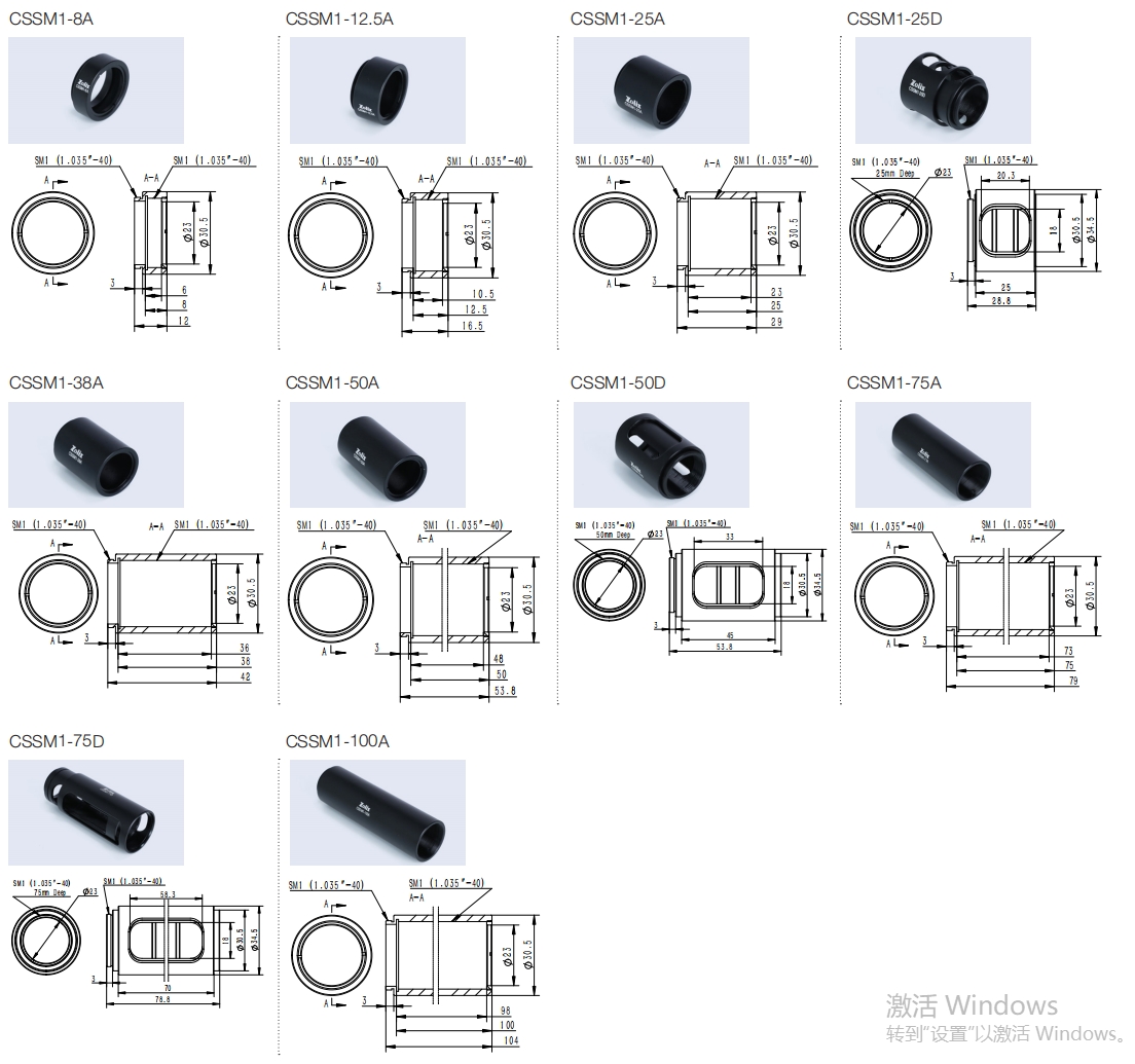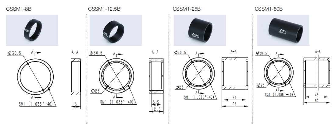 設(shè)計(jì),適合快速搭建緊湊型光學(xué)系統(tǒng)。每個(gè)透鏡套筒都附帶一個(gè) SM1R 卡環(huán)用于固定光學(xué)元件。CSSM1-XXD 帶外開槽,不需要擰出卡環(huán)