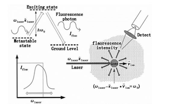 圖1[1]為L(zhǎng)IF的基本原理圖,在一個(gè)三能級(jí)系統(tǒng)中:離子處于亞穩(wěn)態(tài)時(shí),當(dāng)照射激光能量等于躍遷激發(fā)的能量,離子被泵浦到激發(fā)態(tài)。由于激發(fā)態(tài)不穩(wěn)定,離子又會(huì)迅速退激到基態(tài)并輻射出熒光。在激發(fā)態(tài)上停留時(shí)間很短暫(一般只有幾納秒寬度)。由于離子不是靜止的,根據(jù)多普勒效應(yīng)可知,在激光傳輸方向上存在一個(gè)速度選擇,只有在激光傳輸方向上滿足一定速度的離子才能被特定頻率的激光誘導(dǎo)激發(fā):窄帶激光束(ωlaser,κlaser)入射,在入射方向上,只有離子速度 和激光頻率滿足關(guān)系式 時(shí),才能通過(guò)相應(yīng)的激光激發(fā)被泵浦到激發(fā)態(tài)。對(duì)入射激光頻率進(jìn)行掃描變換,測(cè)量相應(yīng)的熒光光強(qiáng)變化,就能得到亞穩(wěn)態(tài)離子速度分布函數(shù)在入射激光方向上的投影。如果假定亞穩(wěn)態(tài)離子溫度和主體基態(tài)離子溫度一致,離子速度分布函數(shù)等動(dòng)力學(xué)參數(shù)即可獲得。