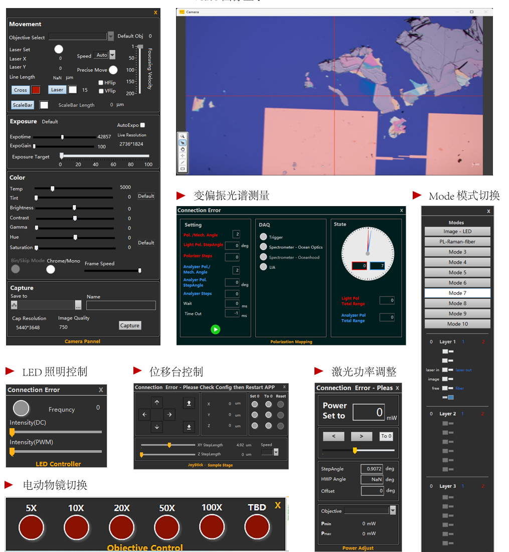 軟件匹配多種光源,光路控制及測(cè)量系統(tǒng)?;谌妱?dòng)化硬件的“Mode”一鍵控制模式,輕松實(shí)現(xiàn)樣品移動(dòng)、樣品對(duì)焦、激光功率控制、多光路自動(dòng)切換及校準(zhǔn)、偏振控制及多維度高通量掃描測(cè)量等功能