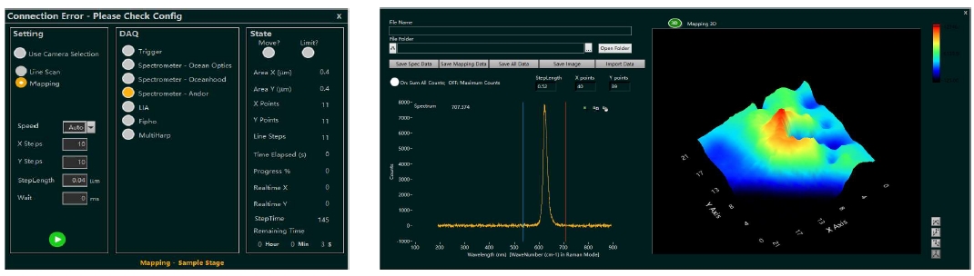 Mapping應(yīng)用實(shí)現(xiàn)成像界面直接框選掃描,多種數(shù)據(jù)采集方式可選;支持常用光譜儀,熒光壽命測(cè)量系統(tǒng),鎖相放大器等采集設(shè)備。偏振掃描APP可實(shí)現(xiàn)多種偏振分辨的自動(dòng)化掃描功能;Mapping測(cè)量支持實(shí)時(shí)數(shù)據(jù)處理與顯示。