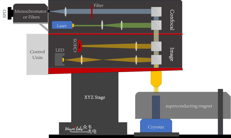 Waynelabs3 的核心研發(fā)成員具有十余年的低溫,強磁場,光譜,自動化控制與采集系統(tǒng)開發(fā)經(jīng)驗。我們將于2024年推出磁場下的微區(qū)光學測試解決方案。它支持最高達12 T磁場,低至2.8 K環(huán)境下的微區(qū)光學測試。包括熒光,熒光壽命,反射光譜,拉曼光譜,偏振分辨二次諧波,光電流,磁光克爾與反射磁圓二色。主要應用于磁性二維材料或磁性薄膜材料與器件的磁性表征,居里溫度表征,表面拓撲磁結構表征,磁疇掃描成像。