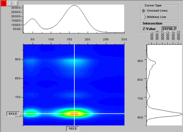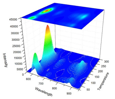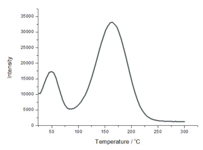 下圖為一種無機(jī)長余輝發(fā)光材料的熱釋光三維光譜以及熱釋光溫度譜。溫度變化范圍為 24℃ ~300℃,升溫的速率為50℃ / 分鐘。該樣品在 613.5nm 處有最強(qiáng)的發(fā)光峰,(b) 圖為從熱釋光三維光譜(a)中切片截取得到的熱釋光—溫度譜線,其峰值對應(yīng)的溫度 Tm=163℃。