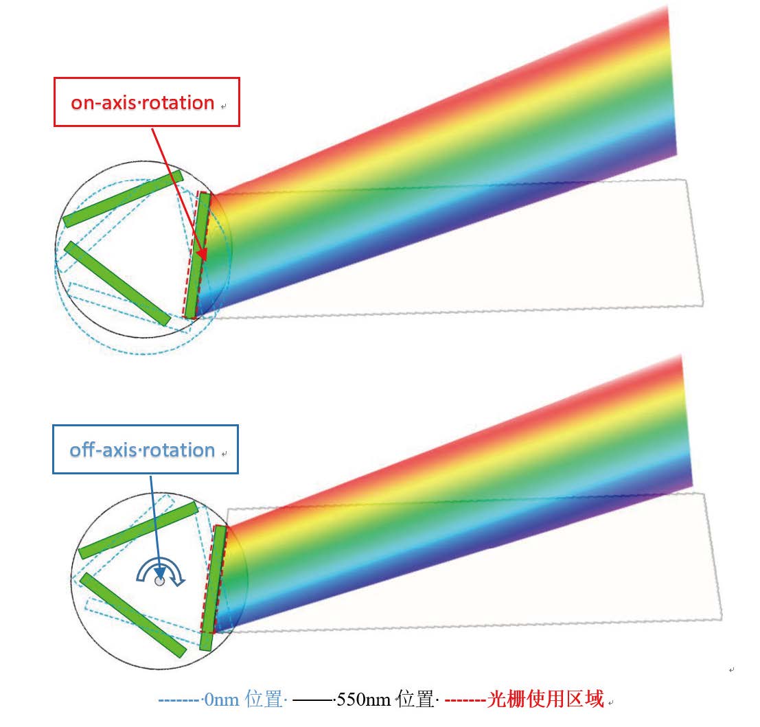 光柵在軸旋轉(zhuǎn)光柵利用率提高15%。(1200g/mm光柵,波長(zhǎng)550nm位置)