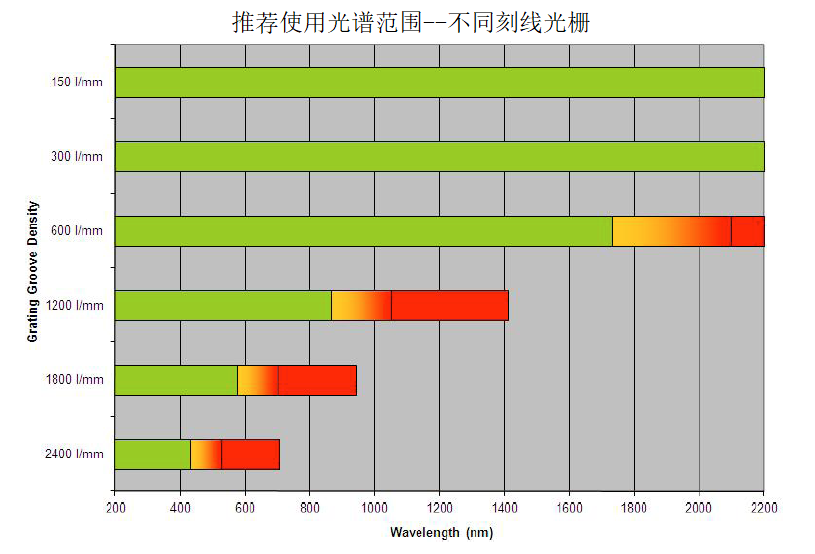 在相同測(cè)試條件下(狹縫不變),提升光譜分辨率的方法通常有兩個(gè):一是延長(zhǎng)光譜儀的焦距,同等情況下,光譜儀的焦距越長(zhǎng),分辨率越高! 但這樣就意味著光譜儀的尺寸變得越來越大,光路調(diào)校變得越來越困難! 另一個(gè)有效途徑是利用高刻畫線的衍射光柵,,比如同等情況下,2400g/mm 的光柵分辨率相比1200g/mm 的光柵可以提升大約1倍; 但同樣由于刻畫光柵衍射角度的關(guān)系,高刻線光柵的波長(zhǎng)使用范圍也同樣會(huì)急劇縮小,比如,1200g/mm 的光柵最大波長(zhǎng)使用范圍到1200nm, 而2400g/mm 的光柵最大波長(zhǎng)使用范圍則只能到600nm, 也就是說通常高刻線光柵都只適用于紫外波長(zhǎng)范圍的高分辨率光譜測(cè)試, 對(duì)于可見光(VIS)以及延伸的紅外 NIR 波段,要想獲得高分辨率的光譜,提高光譜儀的焦距幾乎變成了可行的一種方案!