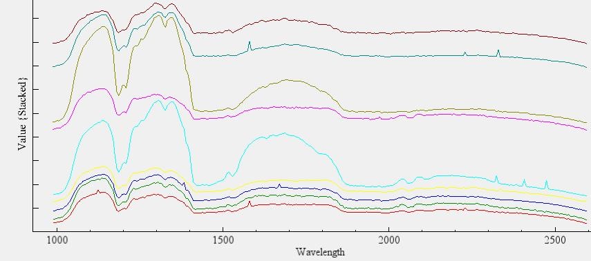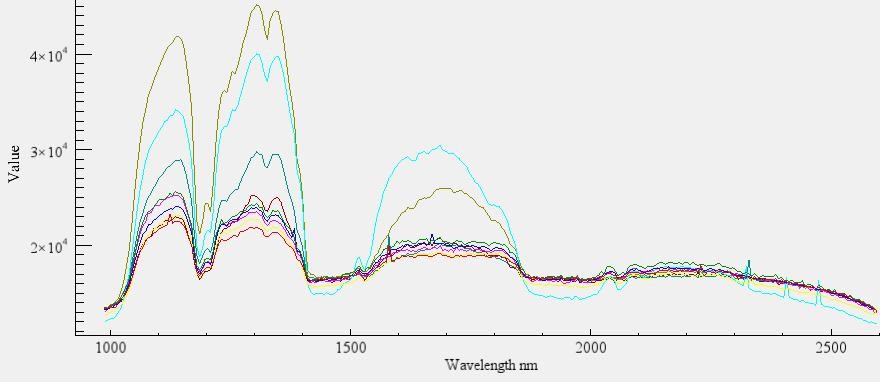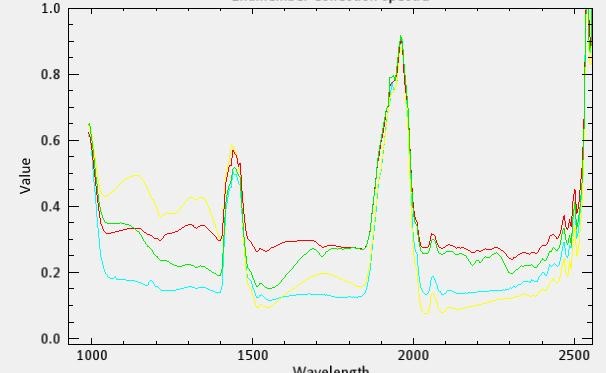 選取不同的目標(biāo)對象,獲取相應(yīng)的光譜,植被的光譜在680nm以后分反射率會提高,而非植被所表現(xiàn)出來的紅邊效應(yīng)與真實(shí)的植被的紅邊效應(yīng)有很大的差別。