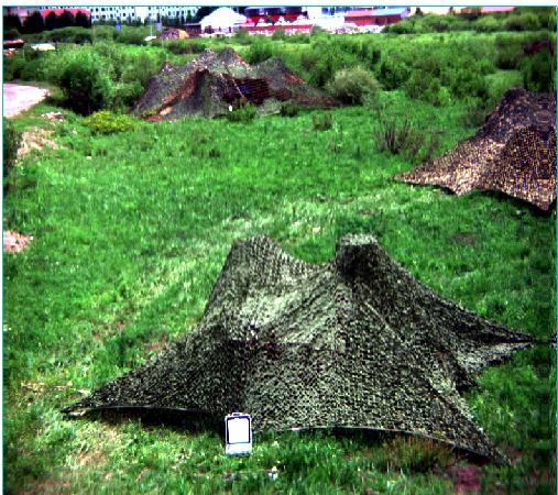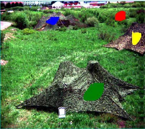 在圖4和圖5所示的是對原始數(shù)據(jù)進(jìn)行數(shù)據(jù)處理后的影像,同樣能夠區(qū)分開目標(biāo)對象與背景的影像,偽裝網(wǎng)如圖中所示標(biāo)注的位置。