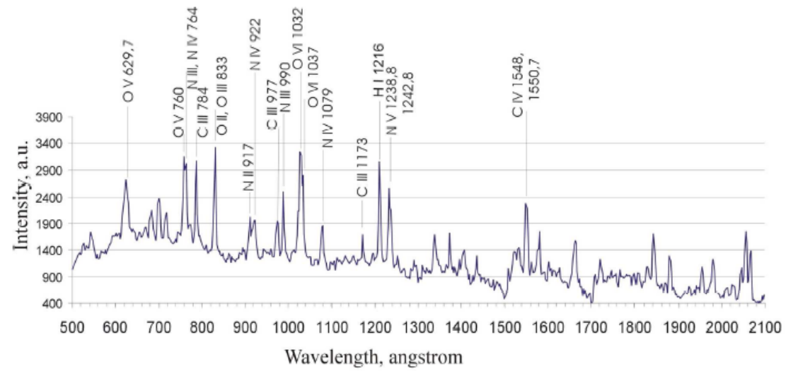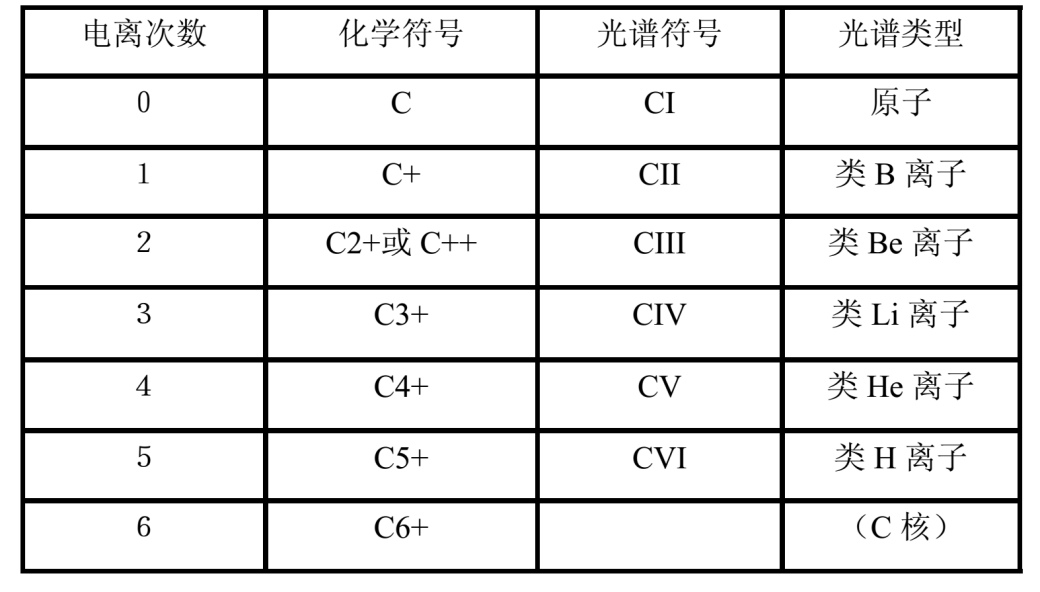 在等離子體參數(shù)較低的小型托卡馬克裝置上,等離子體的輻射主要位于真空紫外和可見光波段。下圖為捷克一個小托卡馬克裝置 CASTOR 中的等離子體發(fā)射光譜,主要在真空紫外和可見光波段。其線狀譜主要是 O,N和 C 的雜質(zhì)譜線。從等離子體發(fā)射光譜圖上可以較為容易地辨別等離子體中雜質(zhì)的種類和電離狀態(tài)。以 C 為例,譜線上標(biāo)志的光譜符號和相應(yīng)的電離態(tài)的關(guān)系如下表所示: