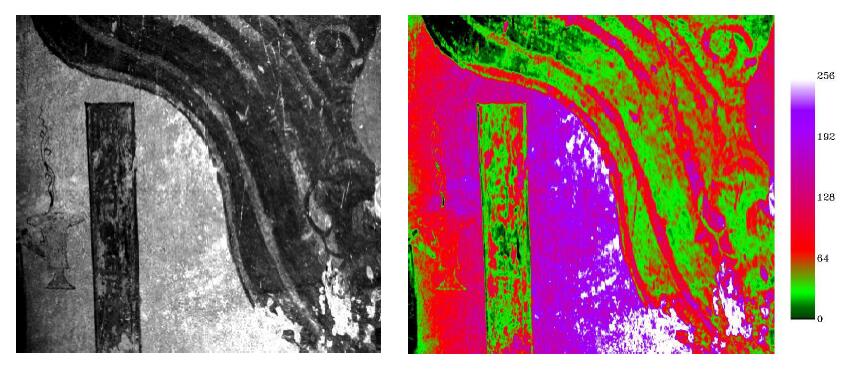 The analysis-animate function of SpecView software was used to quickly browse the gray scale changes of the mural images in each wavelength band, and the results showed that the wavelength bands that can clearly identify the hyperspectral image information such as handwriting in the mural are mainly in the red and near-infrared regions, which is the same as the current research results at home and abroad. Taking the 730 nm band image as an example, the gray scale image of the mural at 730 nm was density segmented in order to more clearly distinguish the changes of the internal components of the mural, as showed in Figure 3. From Fig. 3, it can be seen that by density segmentation of a specific band of the imaging hyperspectral and assigning different colors, not only the changes of the components in the mural can be seen more clearly in the image, but also the changes in their values.