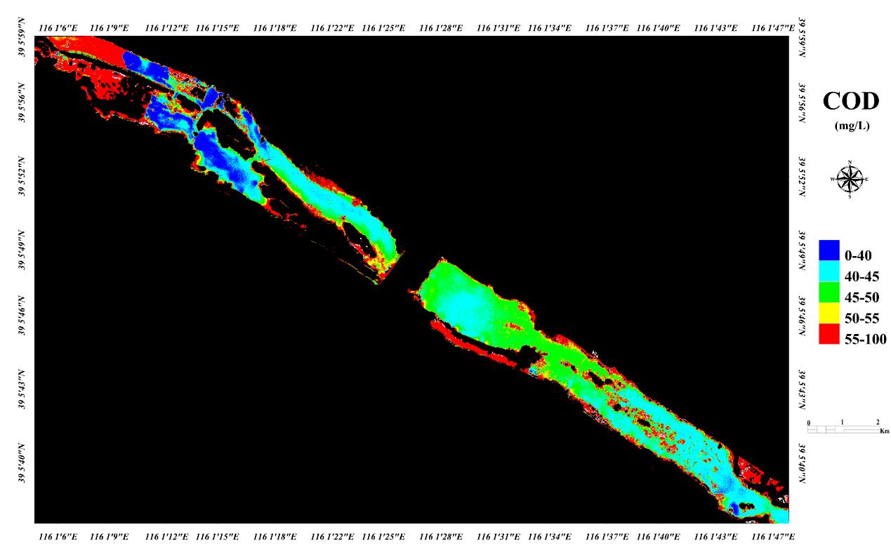 Chemical Oxygen Demand (COD) is an important indicator of water quality monitoring to characterize the amount of reducing substances that need to be oxidized in water. The increasingly serious problem of environmental pollution, traditional measurement methods have been unable to meet the need for sewage detection due to high analysis costs, long time, and secondary pollution. The hyperspectral image data of the Daqing River is obtained by inverting the hyperspectral image data of the UAV according to the water quality chemical oxygen demand monitoring model established by Jiangsu Shuangli Hepu Spectrum, as shown in Figure 9.