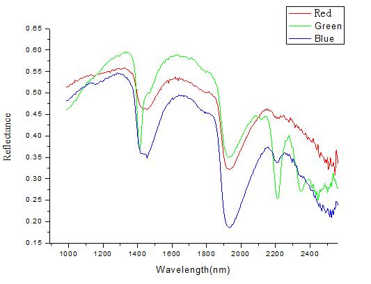 The samples were subjected to an imager in the 400-1000nm band. Spectral characteristic spectral information of mineral rocks in the 400nm-1000nm band was very limited. The spectral characteristics of this band were utilized to classify and identify them, and the results were not ideal. Figure 3 shows one of the samples to be checked, and three regions of interest are selected as the research objects. Figure 4 displays the characteristic spectral curve corresponding to the region of interest in Figure 3. Its characteristic spectral curve is very limited.
