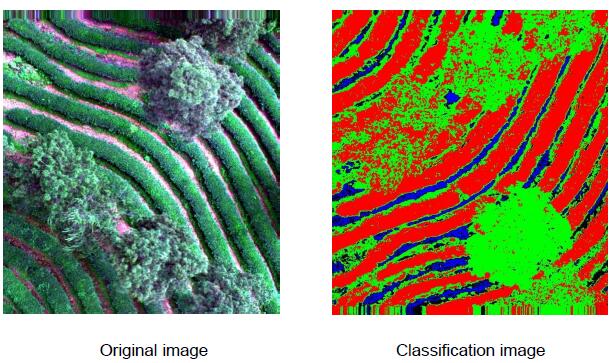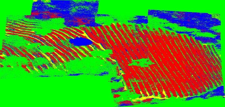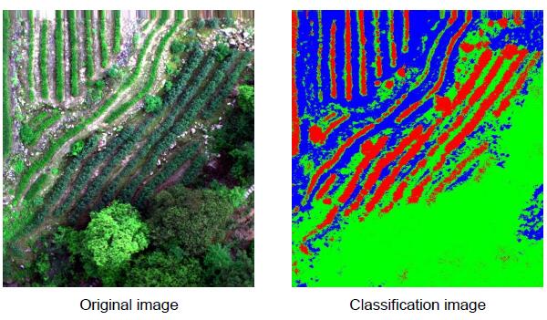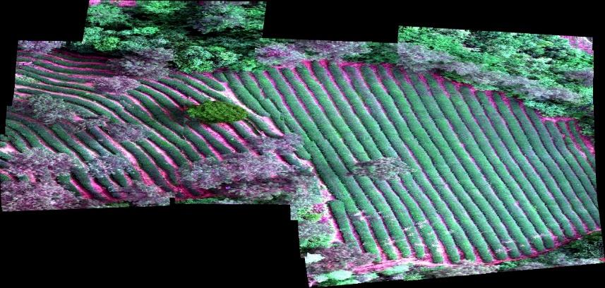Three images from the first frame of the flight were selected, and the whole image after the first frame was stitched together for the classification of tea trees and other tree species identification, and the results are shown in Figures 2 to 4. As can be seen from the figures, the red striped areas are all tea trees, which is a good classification effect and allows an accurate view of the specific location of tea tree distribution.