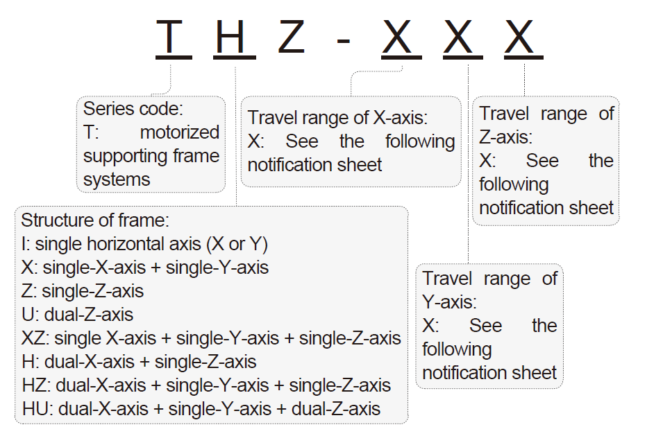 The typical configurations of Txx series motorized supporting frame systems include dual-X, dual-Z axis or the combination of them. It is Dual-side driven mechanism to guarantee motion stability and uniformity of driving forces during operations.
