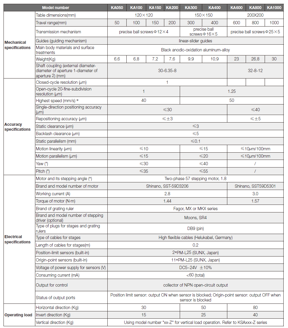 KA series products employ precise-grade ball screws, linear-slider guides and high-performance Shaft coupling units. This kind of design offers good adaptabilities for being used in accurate operation scenarios with relative complex environments. An external grating ruler is used with Zolix controllers MC600 or TMC-USB to ensure 1μm closed-cycle resolution. The other key specifications of this series are also same or similar as those best ones worldwide.