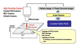 半導(dǎo)體器件和電路制造技術(shù)飛速發(fā)展,器件特征尺寸不斷下降,而集成度不斷上升。這兩方面的變化都給失效缺陷定位和失效機(jī)理的分析帶來(lái)巨大的挑戰(zhàn)。對(duì)于半導(dǎo)體失效分析(FA)而言,微光顯微鏡(Emission Microscope, EMMI)是一種相當(dāng)有用且效率極高的分析工具。微光顯微鏡其高靈敏度的偵測(cè)能力,可偵測(cè)到半導(dǎo)體組件中電子-電洞對(duì)再結(jié)合時(shí)所發(fā)射出來(lái)的光線,能偵測(cè)到的波長(zhǎng)約在350nm ~ 1100nm 左右。 它可以廣泛的應(yīng)用于偵測(cè)IC 中各種組件缺陷所產(chǎn)生的漏電流,如: Gate oxide defects / Leakage、Latch up、ESD failure、junction Leakage等。EMMI的工作原理圖如下: