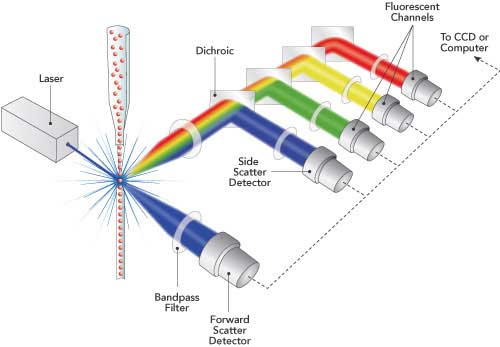 含有被標記的細胞的懸浮液通過管道,一束固定的激光照射到液體上,當每個懸浮顆粒通過光束時會將光散射,同時細胞所標記的熒光化合物被激發(fā)并發(fā)射出頻率低于激發(fā)光的熒光,這些散射光和熒光的數(shù)據(jù)被瞄向這個點的檢測器記錄,通過線性或?qū)?shù)放大,由計算機分析出每個細胞的各種指標。