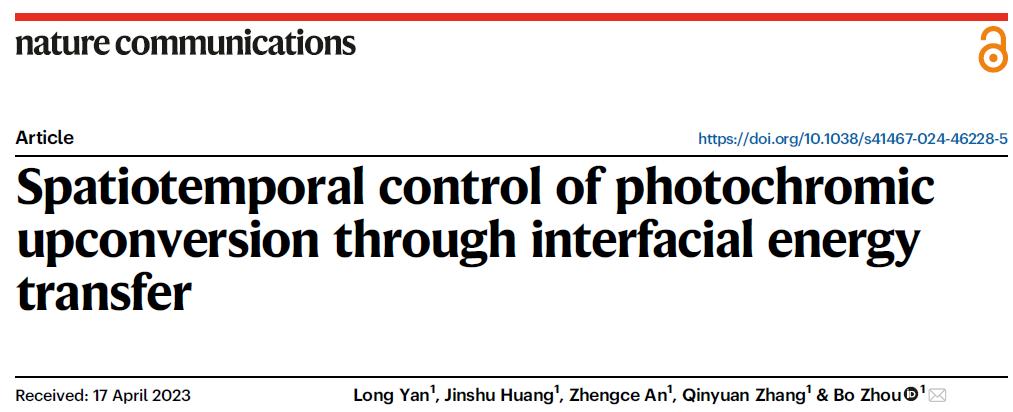針對上述科學問題,華南理工大學發(fā)光材料與器件國家重點實驗室周博教授團隊提出了一種基于界面能量傳遞(IET)的概念模型,在時間和空間維度上實現(xiàn)了上轉換發(fā)光動力學過程調控與光色動態(tài)調節(jié)。該工作以“Spatiotemporal control of photochromic upconversion through interfacial energy transfer”為題發(fā)表在著名期刊Nature Communications上。