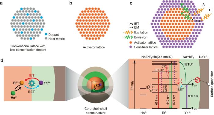 圖1. 基于界面能量傳遞的發(fā)光模型設計。a,b)常規(guī)低濃度摻雜與發(fā)光基質;c)基于界面能量傳遞(IET)的核殼結構設計;d)NaErF4:Ho(0.5 mol%)@NaYbF4@NaYF4核-殼-殼納米粒子及能量過程示意圖。