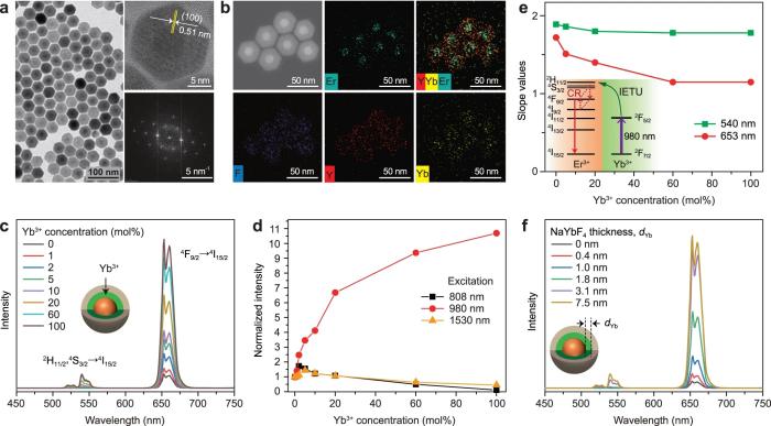 圖2. 樣品形貌及光譜表征。a,b)樣品的TEM圖及元素分布;c,d)變Yb濃度樣品的上轉換光譜及不同波長激發(fā)的發(fā)射強度變化;e)功率-強度雙對數(shù)曲線斜率;f)不同敏化層厚度樣品的上轉換光譜。