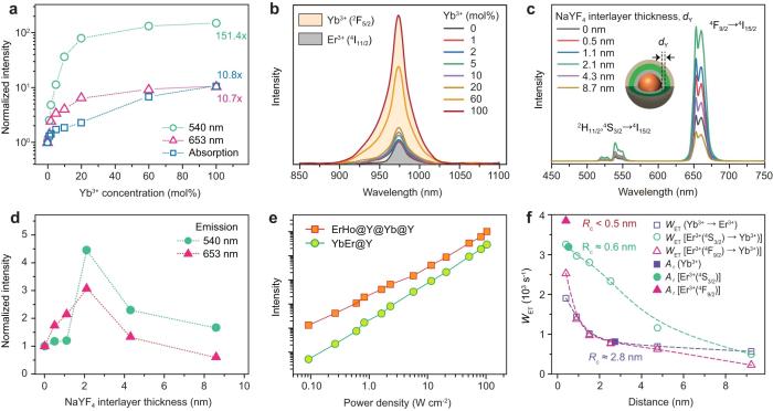 圖3. 納米空間調控上轉換發(fā)光。a)不同Yb3+摻雜濃度樣品的上轉換發(fā)光及吸收變化;b)吸收光譜;c,d)不同NaYF4夾層厚度樣品的上轉換光譜及強度比較;e)與常規(guī)納米粒子的對比;f)能量傳遞速率與離子距離的關系。