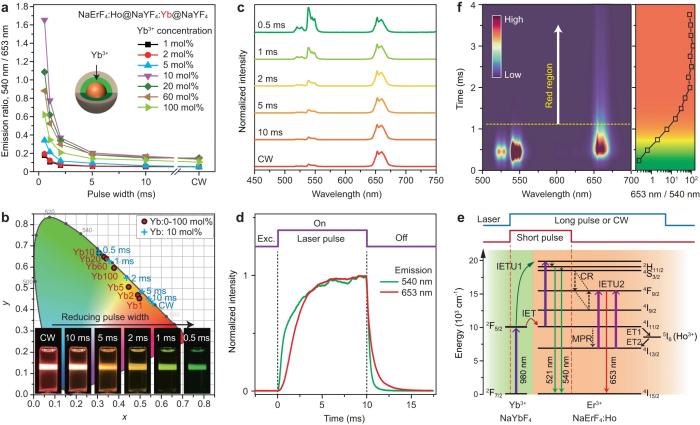 圖4. 時域調控上轉換發(fā)光:a,b)不同脈寬激發(fā)下的綠-紅比變化關系與色度坐標(插圖為樣品的發(fā)光照片);c)不同脈寬激發(fā)下的歸一化光譜;d)Er3+發(fā)光強度隨激發(fā)時間的變化:e)非穩(wěn)態(tài)激發(fā)上轉換發(fā)光顏色變化的機理示意圖;f)時間分辨光譜及紅綠比變化趨勢。