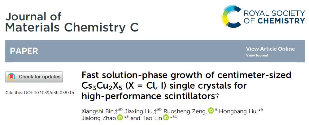 針對上述挑戰(zhàn),廣西大學(xué)物理科學(xué)與工程技術(shù)學(xué)院林濤博士團隊研究人員探索采用采用無鉛的銅(I)鹵化物構(gòu)造新型閃爍體。與納米晶體相比,單晶銅(I)鹵化物單晶在結(jié)構(gòu)缺陷密度低、發(fā)光光子散射效應(yīng)小等方面具有顯著優(yōu)勢,這對實現(xiàn)低劑量高分辨率X射線成像至關(guān)重要。該工作以“Fast solution-phase growth of centimeter-sized Cs3Cu2X5 (X = Cl, I) single crystals for high-performance scintillators”為題發(fā)表在期刊Journal of Materials Chemistry C上。