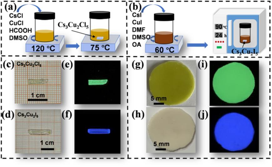 圖1. (a) Cs3Cu2Cl5單晶和(b) Cs3Cu2I5單晶的合成過程。(c) Cs3Cu2Cl5單晶和(d) Cs3Cu2I5單晶形貌。在302 nm紫外光照射下(e) Cs3Cu2Cl5單晶和 (f) Cs3Cu2I5單晶照片。(g) Cs3Cu2Cl5-PMMA薄膜和(h) Cs3Cu2I5-PMMA薄膜外觀。302 nm紫外照射下(i) Cs3Cu2Cl5-PMMA薄膜和 (j) Cs3Cu2I5-PMMA薄膜熒光效果。