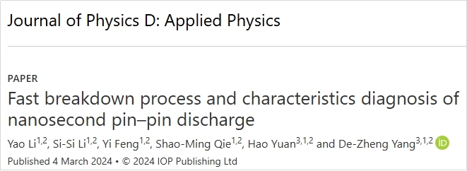 近日,大連理工大學(xué)物理學(xué)院的楊德正教授團(tuán)隊在納秒火花放電中的超快擊穿過程的研究中取得新進(jìn)展,研究成果以” Fast breakdown process and characteristics diagnosis of nanosecond pin-pin discharge”為題發(fā)表在國際**期刊“Journal of Physics D: Applied Physics”上。