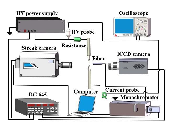 實(shí)驗裝置圖如下圖所示,放電電極由兩根鎢針組成,電極間隙控制在2mm,火花放電由納秒脈沖電源驅(qū)動產(chǎn)生。利用DG645同步納秒脈沖電源、條紋相機(jī)以及ICCD相機(jī)捕獲火花放電超快擊穿過程以及放電模式演化過程的圖像,同時,利用DG645同步納秒脈沖電源以及發(fā)射光譜儀完成對放電過程中產(chǎn)生的活性粒子的產(chǎn)生和淬滅過程的診斷。。
