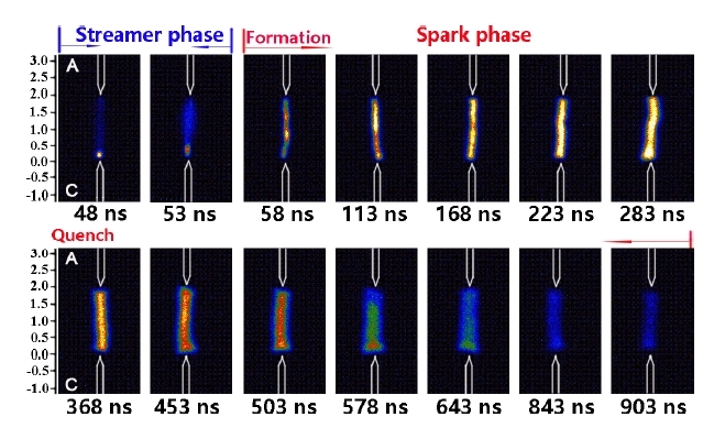 本文系統(tǒng)地研究了大氣壓下單個納秒脈沖內(nèi)的火花放電擊穿現(xiàn)象,通過聯(lián)合使用條紋相機(jī)與ICCD相機(jī),捕捉到了單脈沖內(nèi)火花放電通道的擊穿及演化過程。同時,利用時間分辨的光學(xué)發(fā)射光譜(OES)技術(shù)對放電過程中產(chǎn)生的各活性物種的產(chǎn)生及其淬滅過程進(jìn)行了分析,并對納秒脈沖火花放電等離子體的氣體溫度以及電子密度等特性進(jìn)行了診斷。