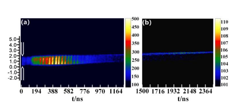 由于初始擊穿過程和流光到火花階段的轉(zhuǎn)換過程通常在幾納秒的時間尺度內(nèi)完成,ICCD相機(jī)難以捕捉到其中變化,因此需要使用分辨率更高的條紋相機(jī),圖3-4為條紋相機(jī)采集到的火花放電過程圖像,采集的時間窗口分別設(shè)置為980ns(Δ t=9.8ns)以及10 ns(Δ t=9100 ps)。從圖3中可以發(fā)現(xiàn),在形成放電通道的初期,靠近負(fù)極的放電發(fā)光更強(qiáng)。而在形成放電通道之后,正極附近的放電更強(qiáng)一些。1500ns之后,火花放電通道熄滅,而在負(fù)極附近仍然可以觀察到放電等離子體的余輝。
