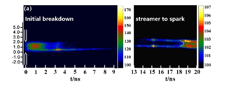 當(dāng)把條紋相機(jī)開到10ns的時間窗口下時(Δ t=100 ps),可更加清晰地觀測到火花放電通道的擊穿和產(chǎn)生的過程(圖4)。圖中可見在陰極亮斑出現(xiàn)之前存在一個均勻放電的階段,這個階段大概持續(xù)了1.8ns,而這個階段在圖2中無法被ICCD相機(jī)分辨出來。條紋相機(jī)圖像清楚地揭示了火花通道形成的五個過程。(1)初始均勻放電階段;(2)陰極亮斑的出現(xiàn);(3)兩個電極附近陰極絲及陽極絲的出現(xiàn);(4)陰極絲及陽極絲的傳播;(5)陰極絲及陽極絲的匯合以及火花放電通道的形成。