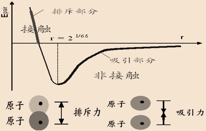 此作用力為原子間的排斥力或吸引力即范德華力(Van Der Waals Force),假設有兩個原子,一個是在微懸臂的探針尖端,另一個是在樣品的表面,它們之間的作用力會隨著距離的變化而變化。當原子和原子很接近時,彼此的電子云排斥力作用會大于原子核與電子云之間的吸引作用,其合力表現(xiàn)為排斥作用。反之,若兩原子分開到一定距離時,其電子云的排斥作用小于彼此原子核與電子云之間的吸引力作用,故其合力表現(xiàn)為吸引作用。在原子力顯微鏡系統(tǒng)中,該作用力隨樣品表面形態(tài)而變化,它會使微懸臂隨之擺動。將一束激光照射在微懸臂的末端,當微懸臂擺動時,會使反射激光的位置改變而造成偏移量,用激光檢測器記錄此偏移量,同時將此信號傳遞給反饋系統(tǒng),以利于系統(tǒng)做適當?shù)恼{(diào)整,從而將樣品表面特征以影像的方式顯現(xiàn)出來。