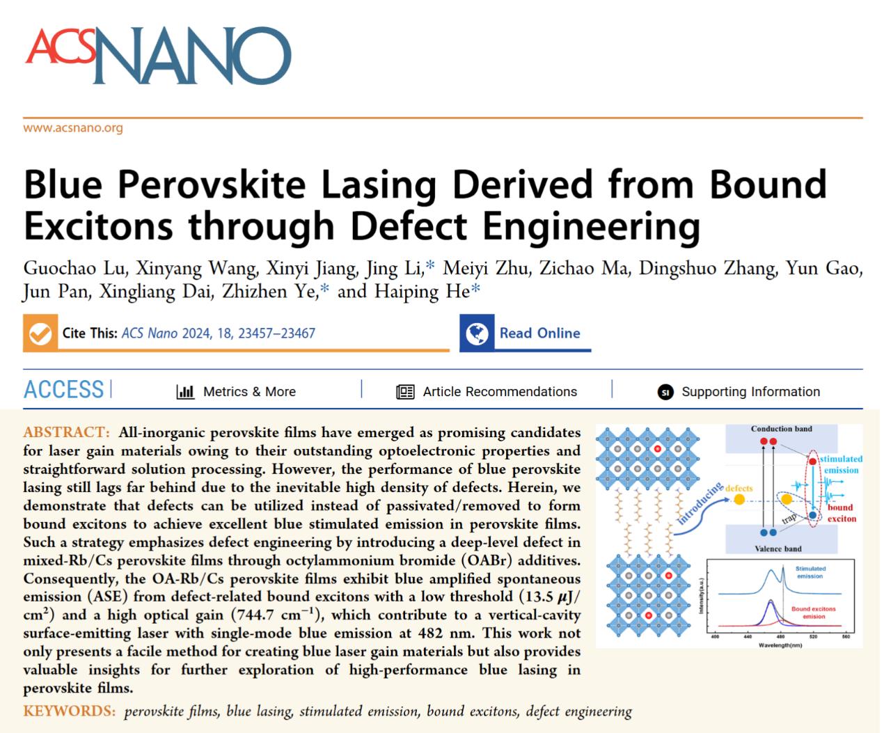 近日,浙江大學(xué)材料學(xué)院葉志鎮(zhèn)院士團(tuán)隊(duì)在藍(lán)色鈣鈦礦激光方面取得重要進(jìn)展,研究成果以“Blue Perovskite Lasing Derived from Bound Excitons through Defect Engineering”為題發(fā)表在國(guó)際期刊ACS Nano (DOI: 10.1021/acsnano.4c06877)上。浙江大學(xué)為該論文第一單位,陸國(guó)超博士與王昕洋博士為共同第一作者,葉志鎮(zhèn)院士、何海平教授、李靜博士為共同通訊作者。