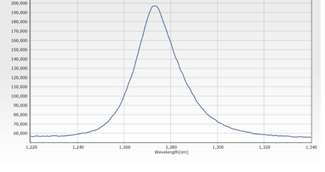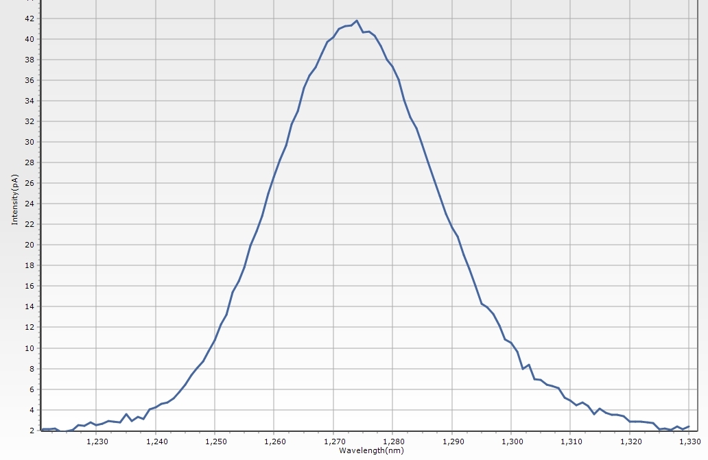 穩(wěn)態(tài)光譜測試使用532nm激光器,能量為80mW。發(fā)射側(cè)光柵刻線密度為600g/mm,閃耀波長為750nm。掃描范圍設(shè)置為1220-1340nm,步長1nm,帶寬3nm,積分時(shí)間200ms,重復(fù)5次。發(fā)射側(cè)使用800nm高通濾光片消除倍頻峰信號干擾。近紅外R5509-73 PMT在1274 nm處測到單線態(tài)氧的發(fā)光峰,如圖3所示。