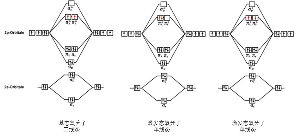 通常我們呼吸的氧氣分子性質(zhì)穩(wěn)定,屬于三線態(tài)氧分子3O2,如果我們從微觀角度去看,氧氣分子中兩個(gè)自旋平行的電子分別占據(jù)兩個(gè)2pπ*軌道,自旋多重性為3,稱為三線態(tài)。當(dāng)基態(tài)氧原子被激發(fā)后,原本兩個(gè)2pπ*軌道中兩個(gè)自旋平行的電子,既可以自旋相反地同時(shí)占據(jù)一個(gè)2pπ*軌道,也可以分別占據(jù)兩個(gè)2pπ*軌道。這兩種分子激發(fā)態(tài)下的自旋多重性均為1,也就是接下來要介紹的單線態(tài)氧分子1O2。