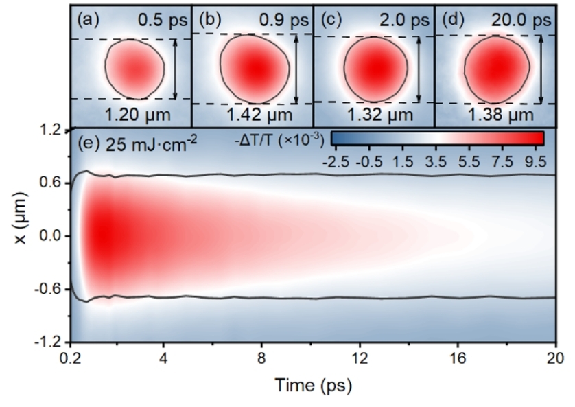 圖1. 激發(fā)光選用515nm聚焦光束(激發(fā)功率密度為25mJ/cm2),以700nm探測光(帶寬40nm)進(jìn)行成像, 探測時間為(a)0.5ps,(b)0.9ps,(c) 2.0ps,(d)20.0ps的二維TAM光譜,在不同的延遲時間下標(biāo)記出半高寬。(e)激發(fā)功率密度為25mJ/cm2時載流子密度分布圖。[1]