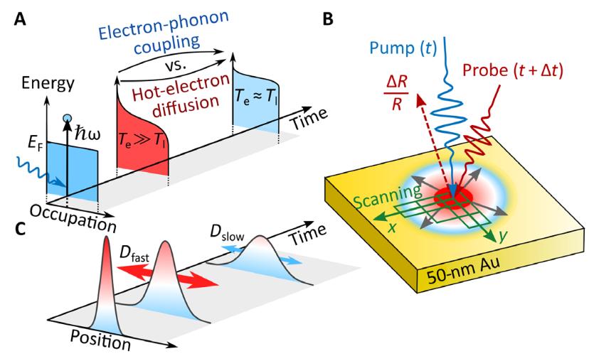 圖2. 掃描超快熱調(diào)節(jié)顯微鏡的原理圖。(A)在環(huán)境溫度下, 導(dǎo)帶電子的能量分布受到光激發(fā)的擾動。它迅速演變?yōu)榫哂懈唠娮訙囟龋═e)的準(zhǔn)熱化“熱電子”,符合費米-狄拉克分布。而晶格溫度(Tl)保持接近環(huán)境水平。由于電子-聲子耦合和熱載流子擴(kuò)散的后續(xù)冷卻導(dǎo)致電子和晶格子系統(tǒng)之間的熱交換和熱平衡。(B)激光脈沖照射50nm的金薄膜,從而引起局部熱電子分布。探測光脈沖測量溫度相關(guān)的瞬態(tài)反射率(DR/R)。(C)探測光監(jiān)測光致DR/R光斑尺寸的時空演變,以可視化和區(qū)分熱電子擴(kuò)散和熱(聲子限制)擴(kuò)散。[2]