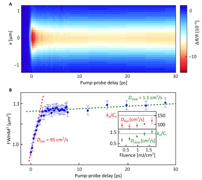 圖3. 金屬熱電子的兩步擴(kuò)散動力學(xué)。(A)瞬態(tài)反射信號DR/R的時空動態(tài), 泵浦能量密度1.0 mJ/ cm2下,隨時間變化的瞬態(tài)反射信號的輪廓變化。(B)通過高斯擬合提取DR/R空間輪廓的平方寬度演化。[2]