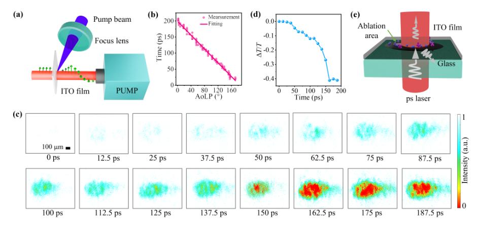 圖.飛秒激光燒蝕ITO薄膜的超快成像: (a)實驗設(shè)計,(b)200 ps照明激光脈沖時偏振映射關(guān)系。(c) ITO膜燒蝕的時空演變,(d)燒蝕區(qū)透射率差ΔT/T,(e)飛秒激光燒蝕ITO薄膜的機(jī)理.[3]