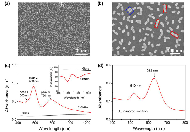 (c) R-GNRA的吸光度和透射光譜,780 nm峰源自納米棒耦合。
