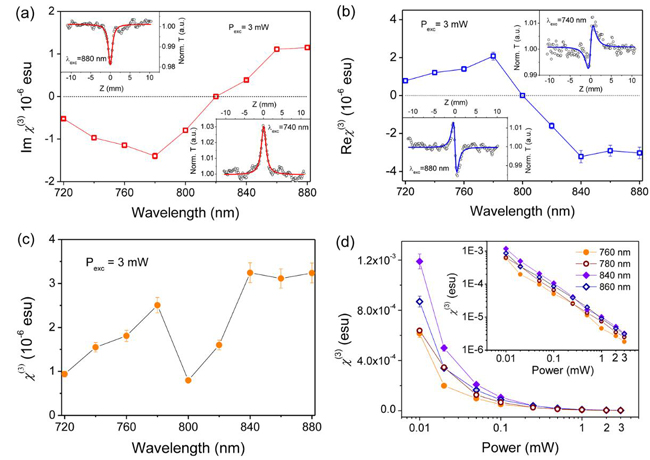 (d) 不同波長下χ?³?的功率依賴性(10 μW-3 mW)。