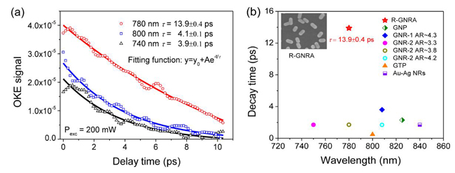 (a) R-GNRA在740/780/800 nm的OKE衰減曲線,780 nm處弛豫時(shí)間*長。
