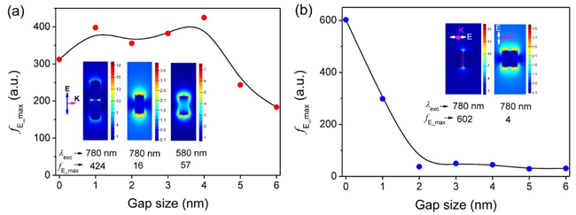 (a) 端對(duì)端排列納米棒二聚體的電場(chǎng)增強(qiáng)因子(f???)隨間隙變化,插圖為1 nm間隙的電場(chǎng)分布。