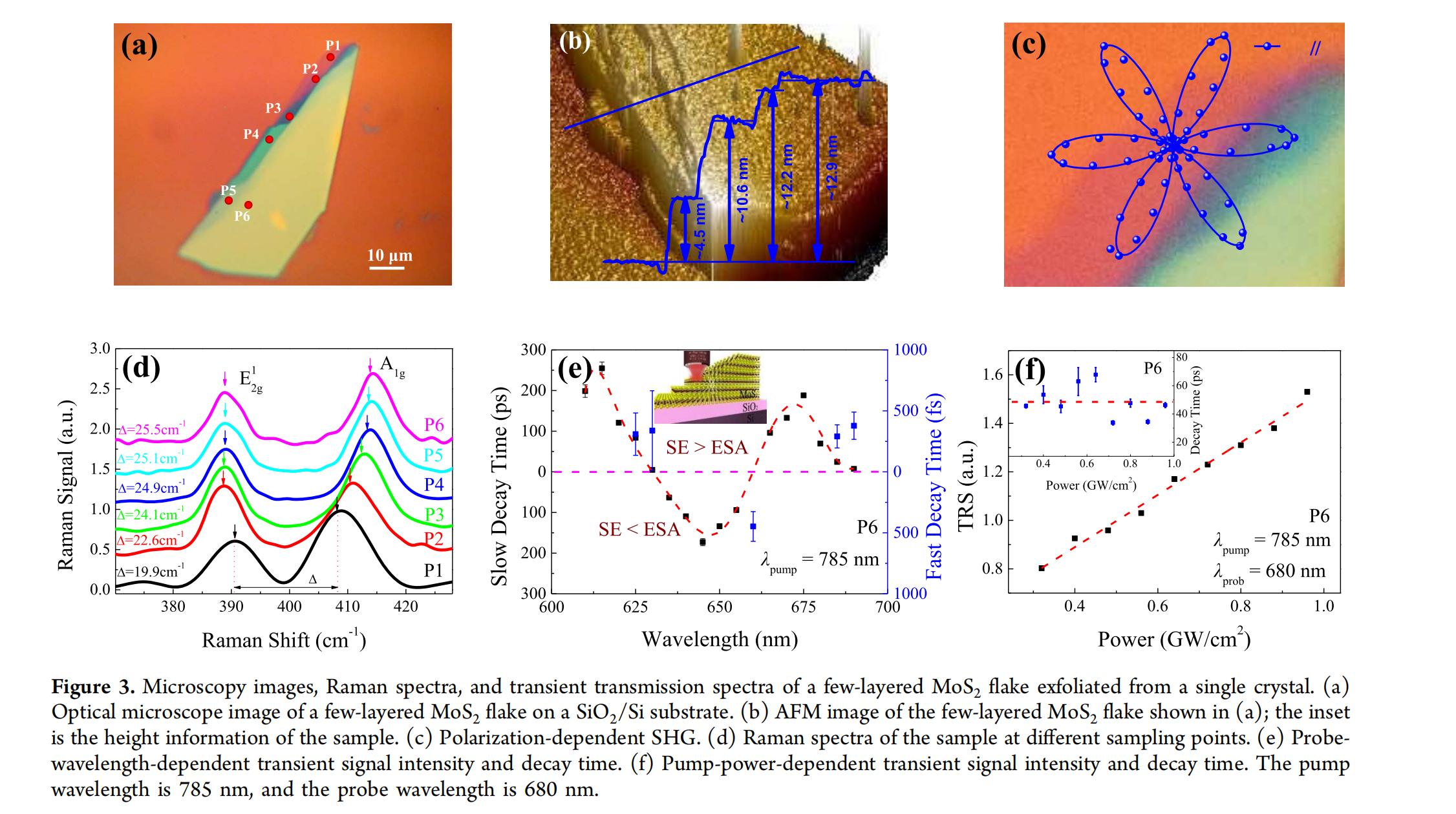 圖3a-c展示了二硫化鉬片的光學(xué)圖像、原子力顯微鏡(AFM)圖像以及二次諧波(SHG)圖案,從這些圖像中可以觀察到六個(gè)不同厚度的位置(標(biāo)記為P1-P6),其厚度分別約為3.0、3.5、4.4、6.7、10.5和12.9納米(從4到20層,詳情見原文)。SHG圖案也顯示出6重對(duì)稱性,這與CVD樣品的結(jié)果一致。圖3d展示了該片在P1-P6不同采樣點(diǎn)的拉曼散射光譜。
