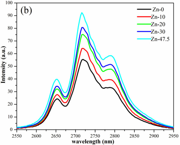 根據(jù)表1的結(jié)果顯示,隨著ZnF2逐漸取代PbF2,玻璃中的羥基吸收系數(shù)逐漸減弱、羥基濃度逐漸減小,說明利用ZnF2取代PbF2制備出來的玻璃具有更低的羥基濃度,而羥基又是玻璃紅外發(fā)光的淬滅中心,所以玻璃的發(fā)光強(qiáng)度隨著玻璃中的羥基含量降低而增強(qiáng)。