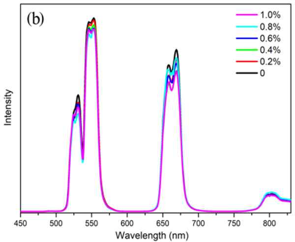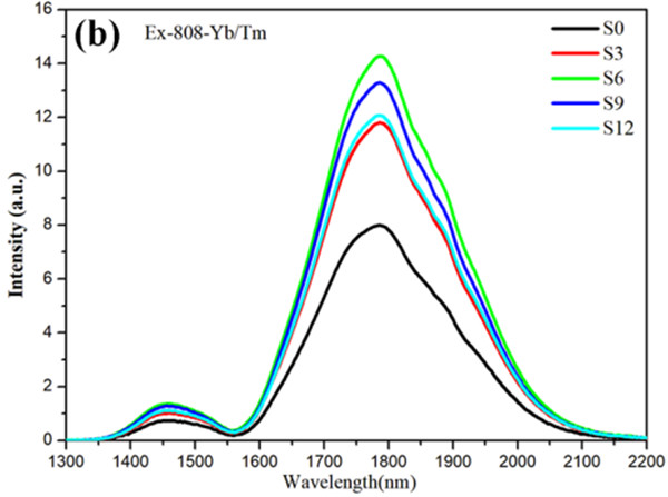 (b)樣品在不同硫酸根用量時(shí)650℃熱處理3h后在808nm激光激發(fā)下的近中紅外發(fā)光,
