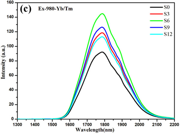 (c)樣品在不同硫酸根用量時(shí)650℃熱處理3h后在980nm激光激發(fā)下的近中紅外發(fā)光,