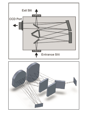 當(dāng)一束復(fù)合光線進(jìn)入單色儀的入射狹縫,首先由光學(xué)準(zhǔn)直鏡匯聚成平行光,再通過衍射光柵色散為分開的波長(顏色)。利用每個(gè)波長離開光柵的角度不同,由聚焦反射鏡再成像出射狹縫。通過電腦控制可精確地改變出射波長。