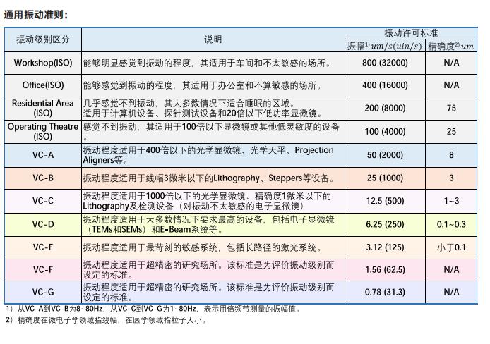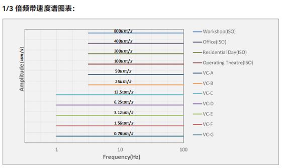 為了作出區(qū)分,人們進行了很多的研究,并且發(fā)現(xiàn),根據(jù)頻率的不同,設(shè)備所作出的位移響應(yīng)雖然不同,然而速度響應(yīng)幾乎是相同的。因此,為了規(guī)定各種活動以及對于設(shè)備所允許的振動級標(biāo)準(zhǔn),通常使用 1/3 倍頻帶速度譜。這一標(biāo)準(zhǔn)曲線的優(yōu)點是能夠表示用速度的有效值來表達(dá)出振動,而非用位移或加速度來表達(dá),以及如果設(shè)備種類相同,性能開始受影響的速度值也基本相似。